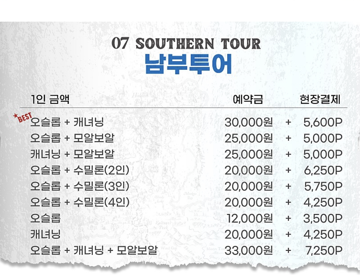 해적호핑이라는 곳에서 캐녀닝, 오슬롭, 투말록 이렇게 세트로 판매하는 상품이 있어 문의했습니다.